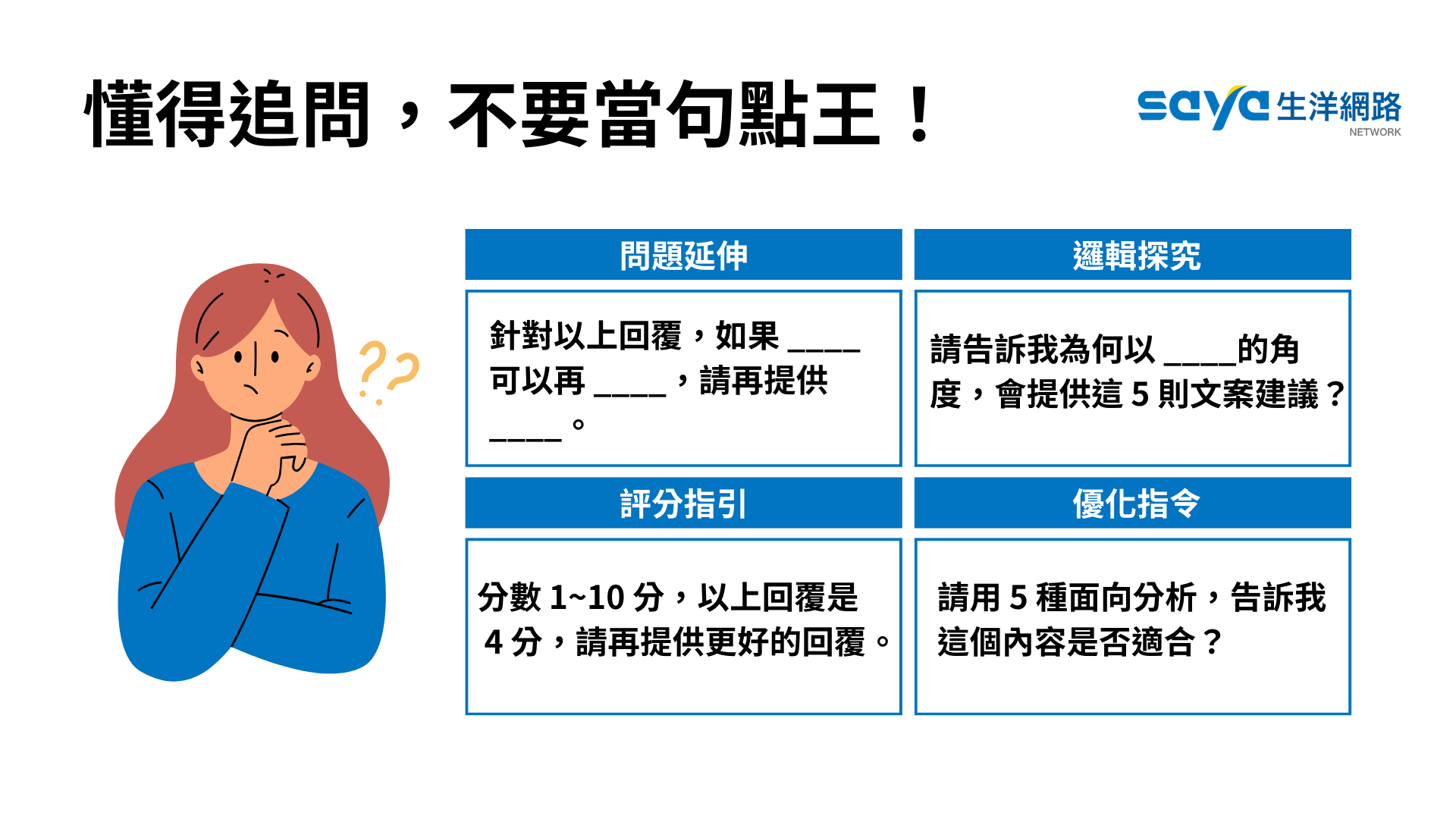 想讓AI不只提供表面答案,而是能深入探討問題的核心?以下四個追問技巧,幫助品牌主與AI互動更有層次感,避免當句點王。