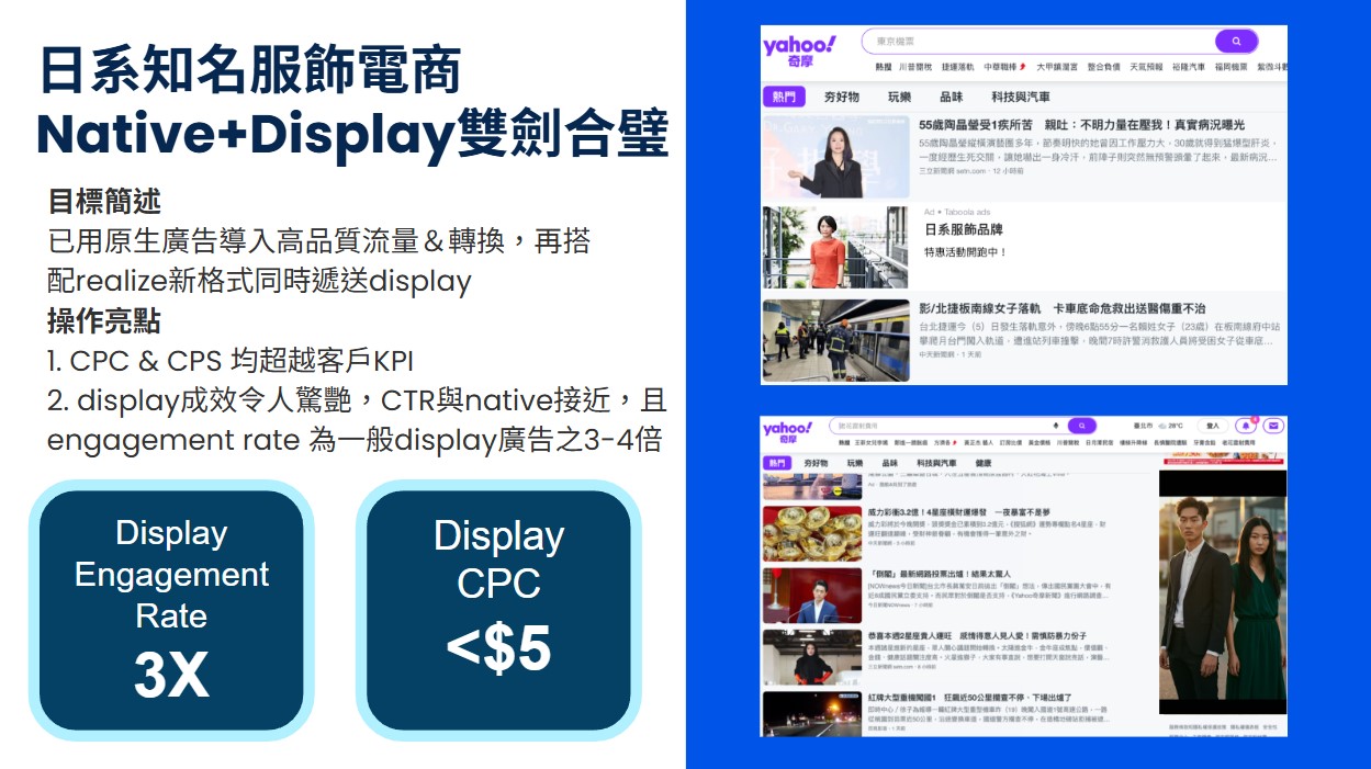 這間服飾品牌原先已使用Taboola原生廣告獲得穩定的高品質流量與轉換,本次加入Display廣告後效果驚艷,雙劍合璧創下以下亮點:
