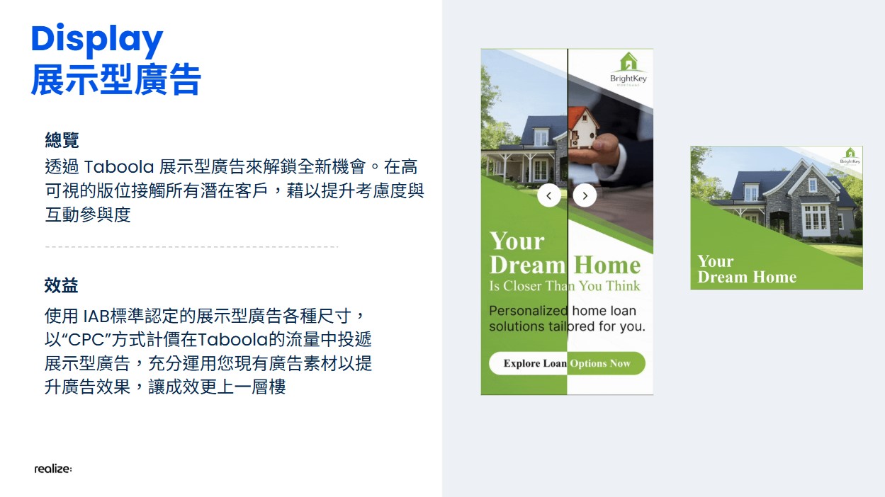 將展示廣告素材套用至Taboola內容流量中,以CPC計價,提升素材延用率與廣告效率。