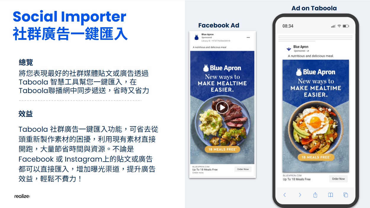 FB/IG 廣告或貼文可一鍵導入 Taboola,讓你用社群素材觸及社群以外的潛在受眾,再也不用反覆製作。