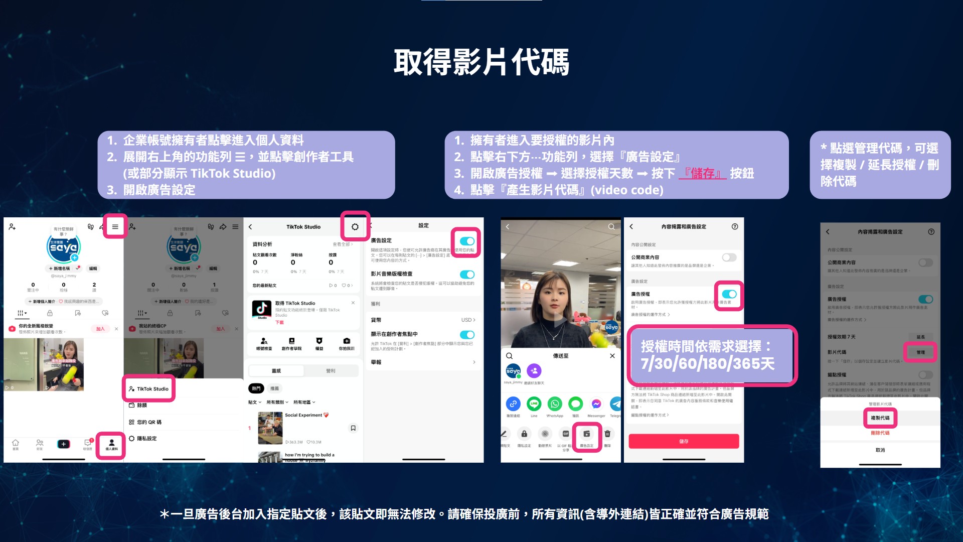 2.回到個人資訊並點擊要投放的影片素材 → 點擊右下方 ⋯ → 向右滑動點擊 廣告設定 → 開啟廣告授權 → 選擇授權天數 → 按 儲存。