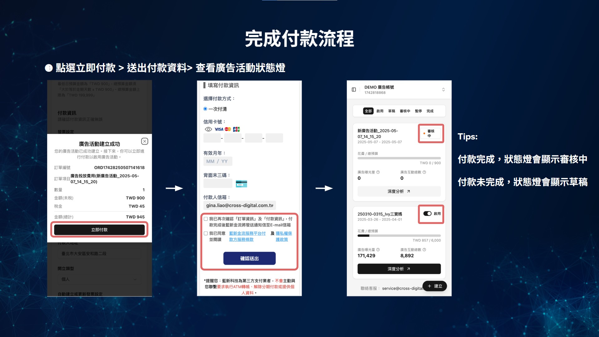 3.點選立即付款 → 填寫付款資訊 → 確認送出 → 查看廣告活動狀態燈