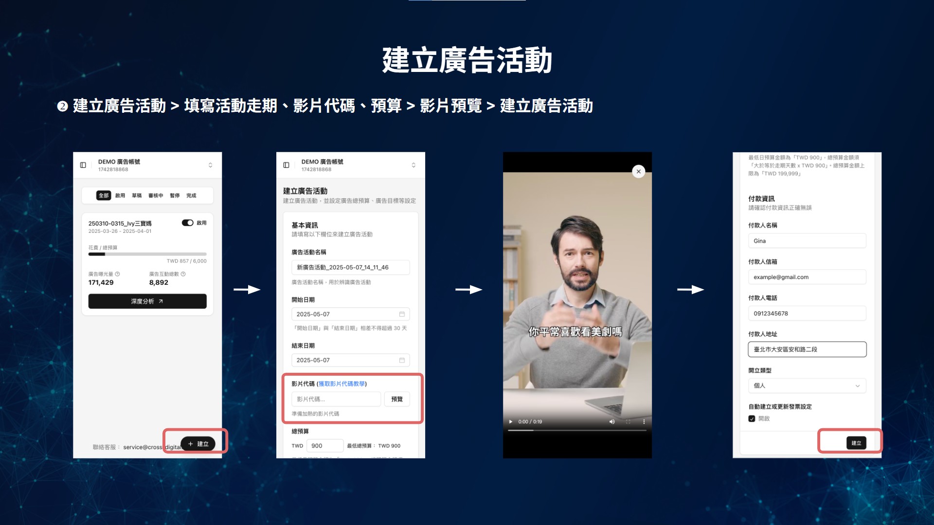 2.右下角 +建立 廣告活動 → 填寫廣告活動名稱、開始日期、結束日期、貼上影片代碼(影片預覽)、總預算(最低日預算900元) → 填寫付款資訊 → 建立廣告活動