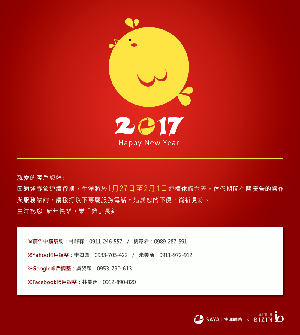 生洋網路全體同仁祝您新年快樂,業「雞」長紅!!