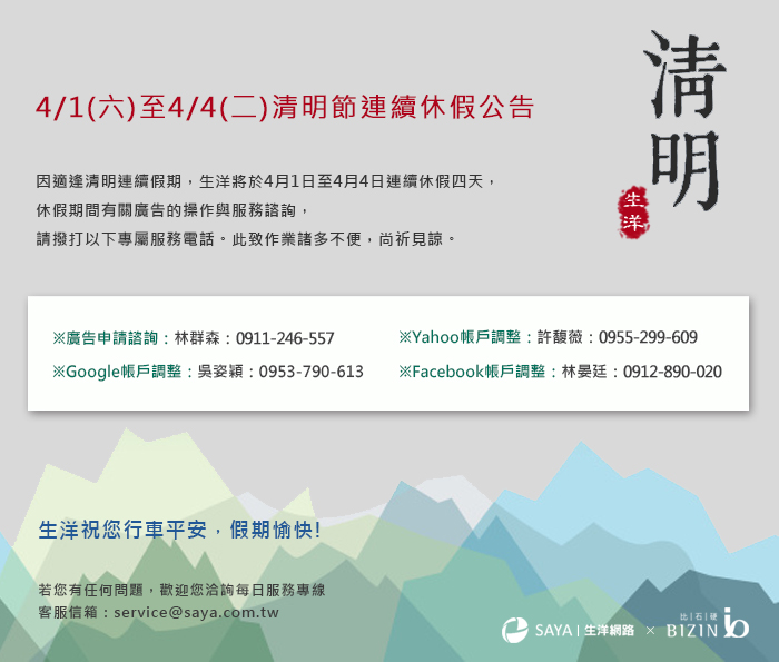 4/1(六)至4/4(二)因適逢清明節連續假期休假四天。