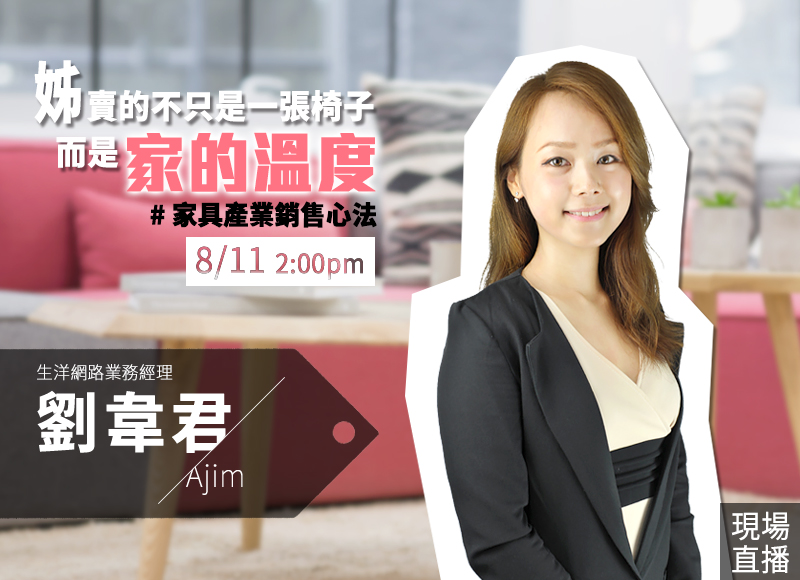 本週8/11(五)下午2:00,家具銷售一姊,同時也是生洋網路業務經理──劉韋君 Ajim,