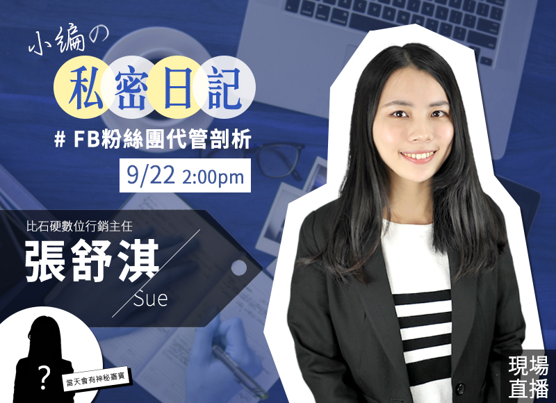 本週9/22(五)下午2:00,比石硬數位行銷主任──張舒淇 Sue,