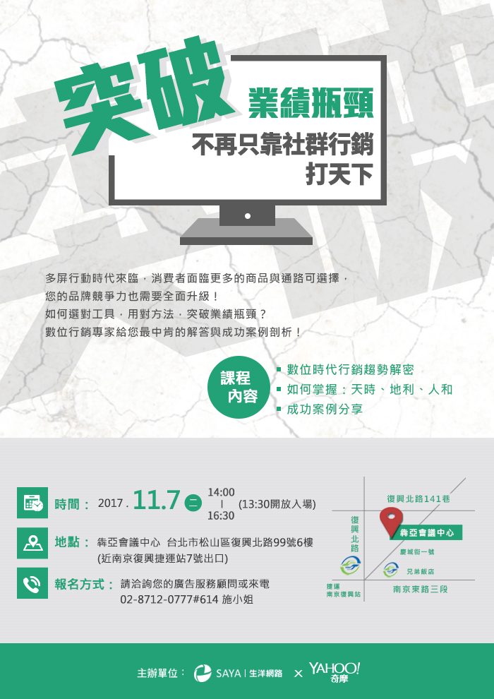 11/7(二)生洋網路 x Yahoo 突破業績瓶頸說明會,名額有限請及早報名