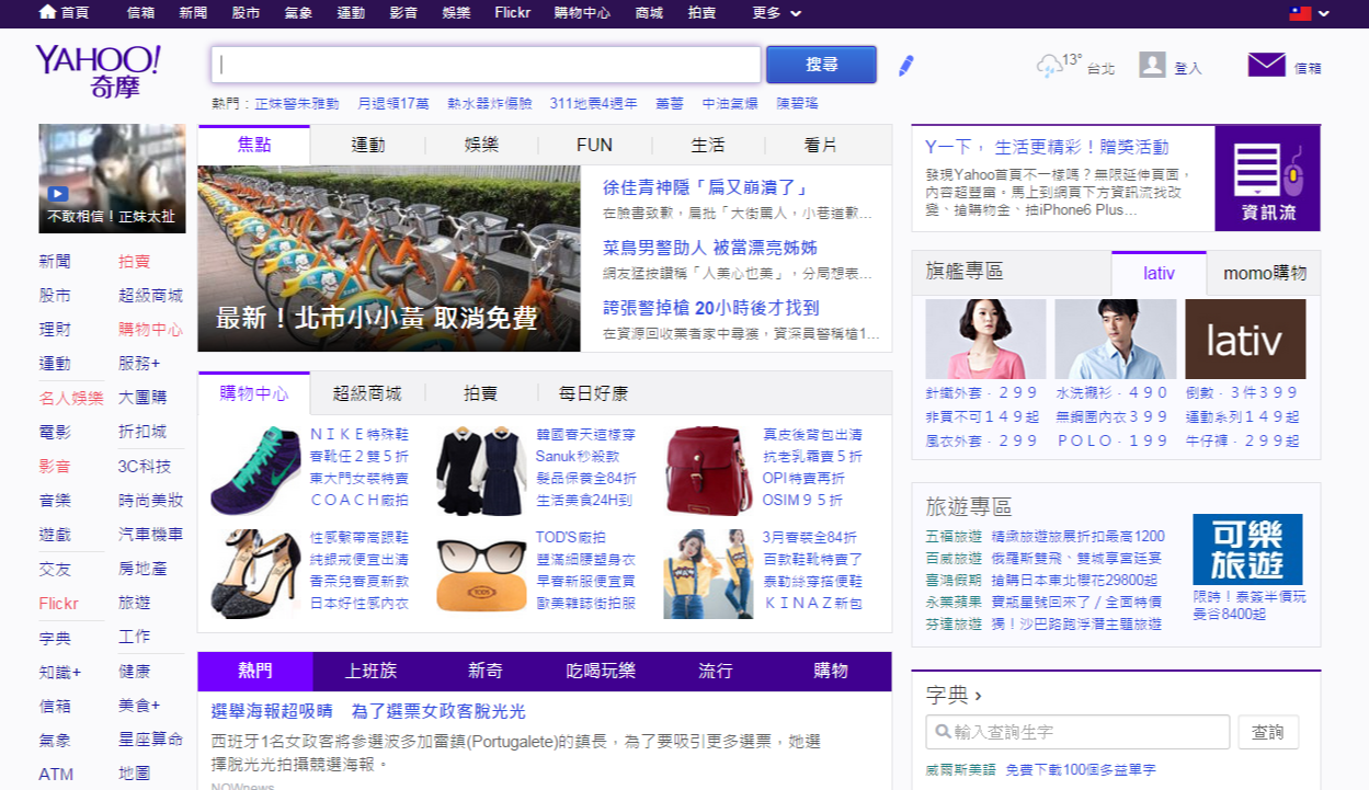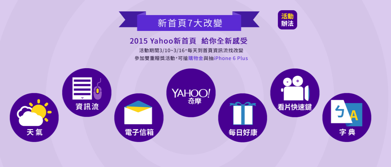 迎接Yahoo邁入20週年之際,台灣Yahoo奇摩也宣佈推行全新首頁服務,強調將是近8年以來最大規模改版,並且融入跨螢幕使用思維與高度個人化設定,讓每位使用者都能透過全新首頁取得個人所需資訊。在新版首頁服務中,將以Yahoo本身技術從巨量數據中分析上億種網路使用行為,即可配合使用者瀏覽行為自動提供最佳合適內容,其中包含4000則以上的新聞、娛樂、購物、吃喝玩樂等多元資訊。