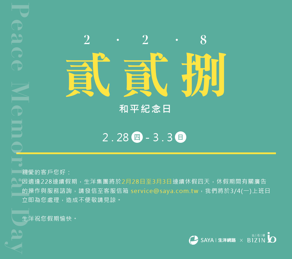 2/28(四)至3/3(日)因適逢228連續假期休假四天。