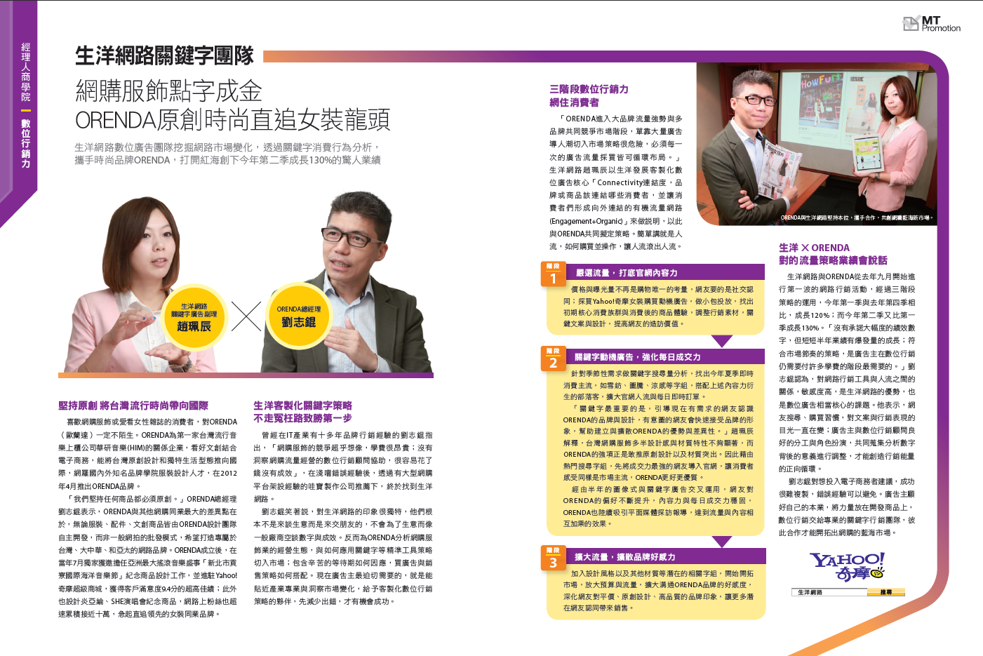 生洋網路趙珮辰與ORENDA共同擬定策略,從去年九月開始進行第一波的網路行銷活動,經過三階段策略的運用,今年第一季與去年第四季相比,成長120%;而今年第二季又比第一季成長130%「沒有承諾大幅度的績效數字,但短短半年業績有爆發量的成長」
