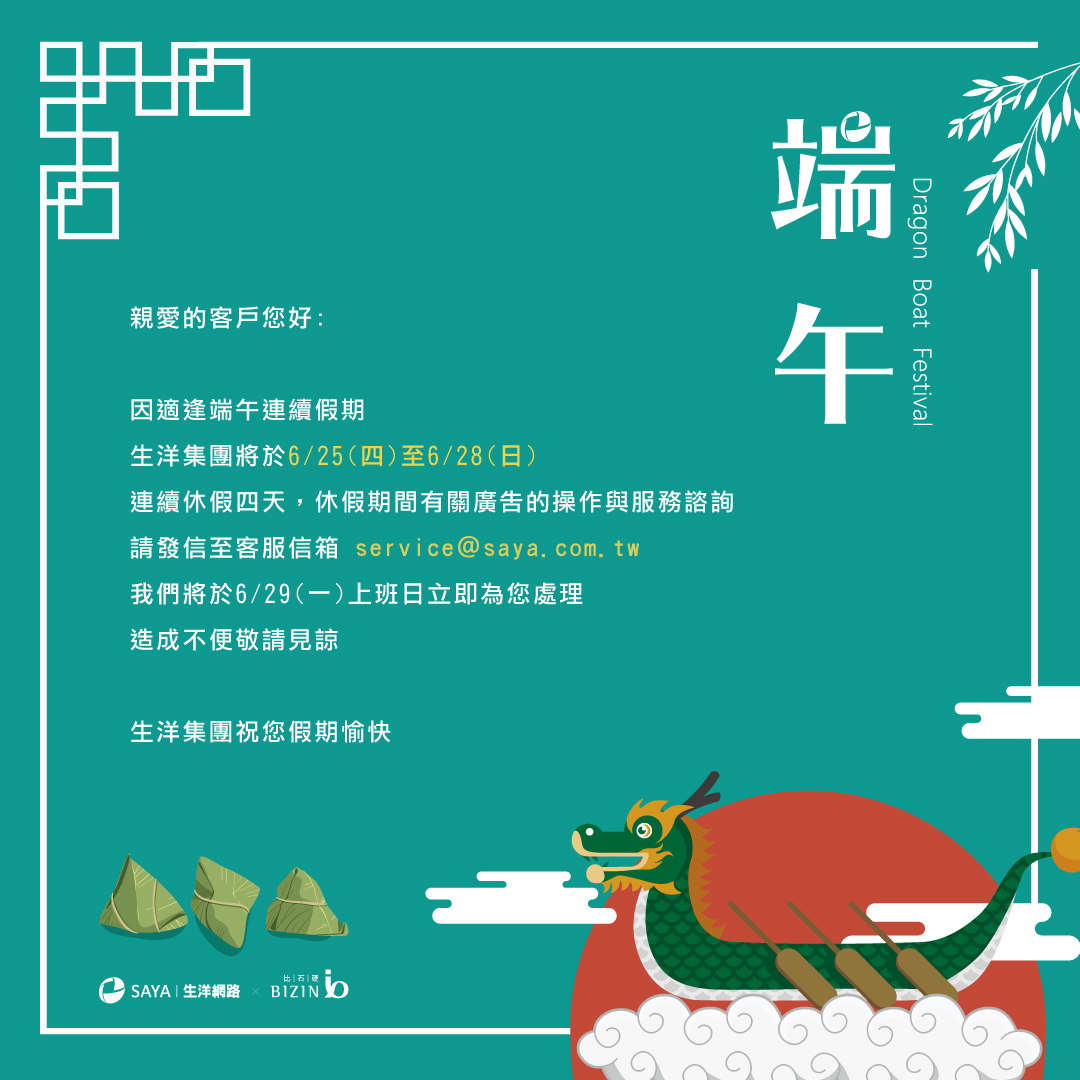 6/25(四)至6/28(日)因適逢端午節連續假期休假四天