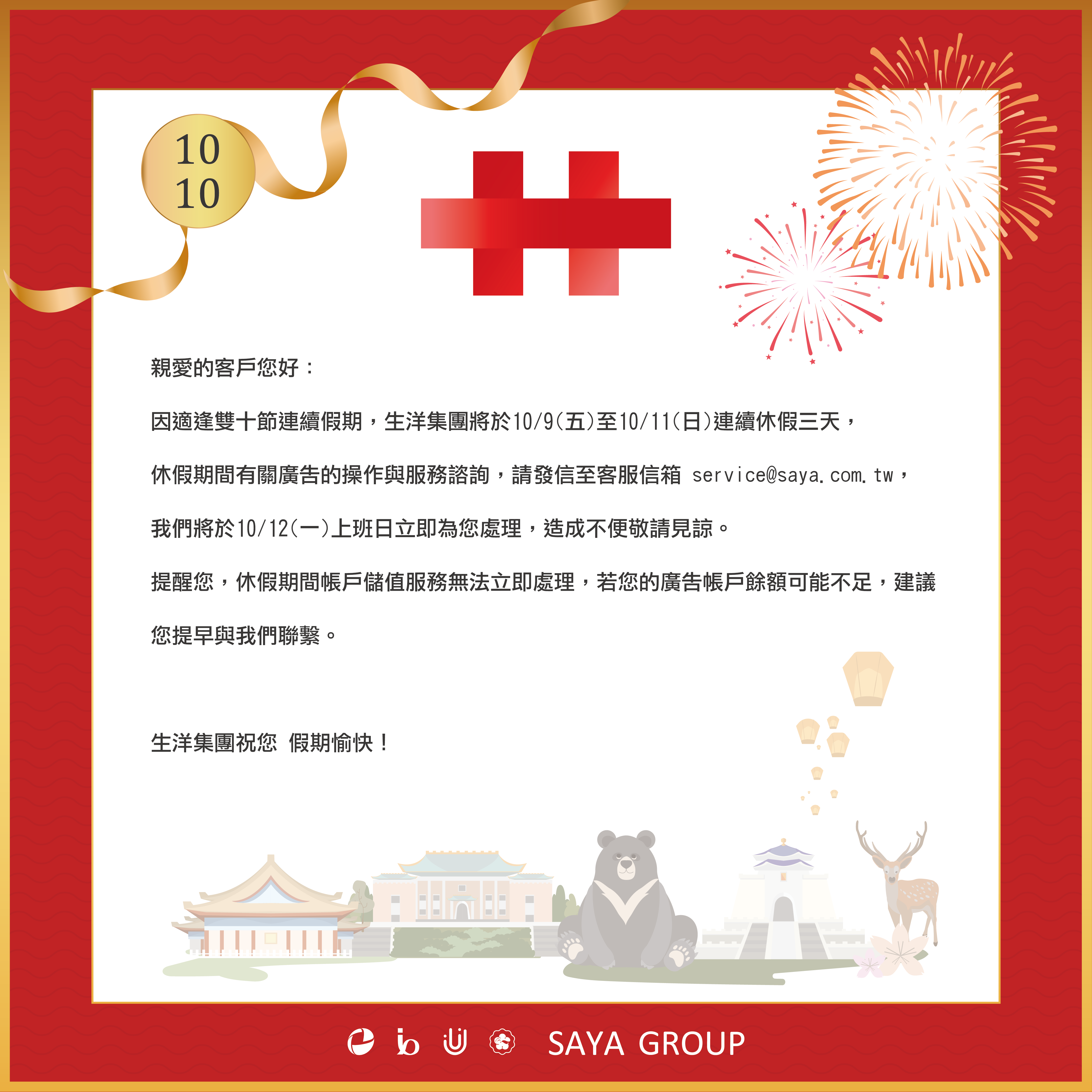 10/9(五)至10/11(日)因適逢雙十節連續假期休假三天