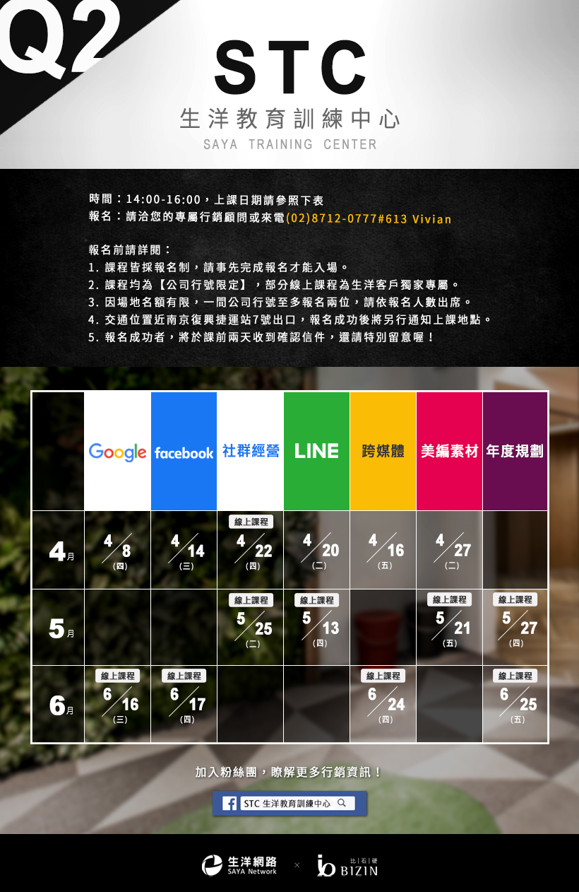 【2021.05.19 因受疫情影響,課表可能會有所異動,歡迎有興趣上課的廣告主與我們聯繫報名,並以課程報名信件上的資訊為主,如有問題歡迎點擊右方連結STC生洋教育訓練中心粉絲團與小編聯繫喔!】