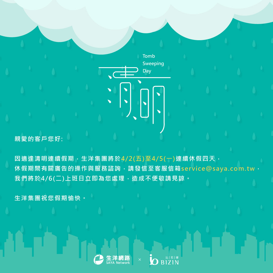 4/2(五)至4/5(一)因適逢清明節連續假期休假四天