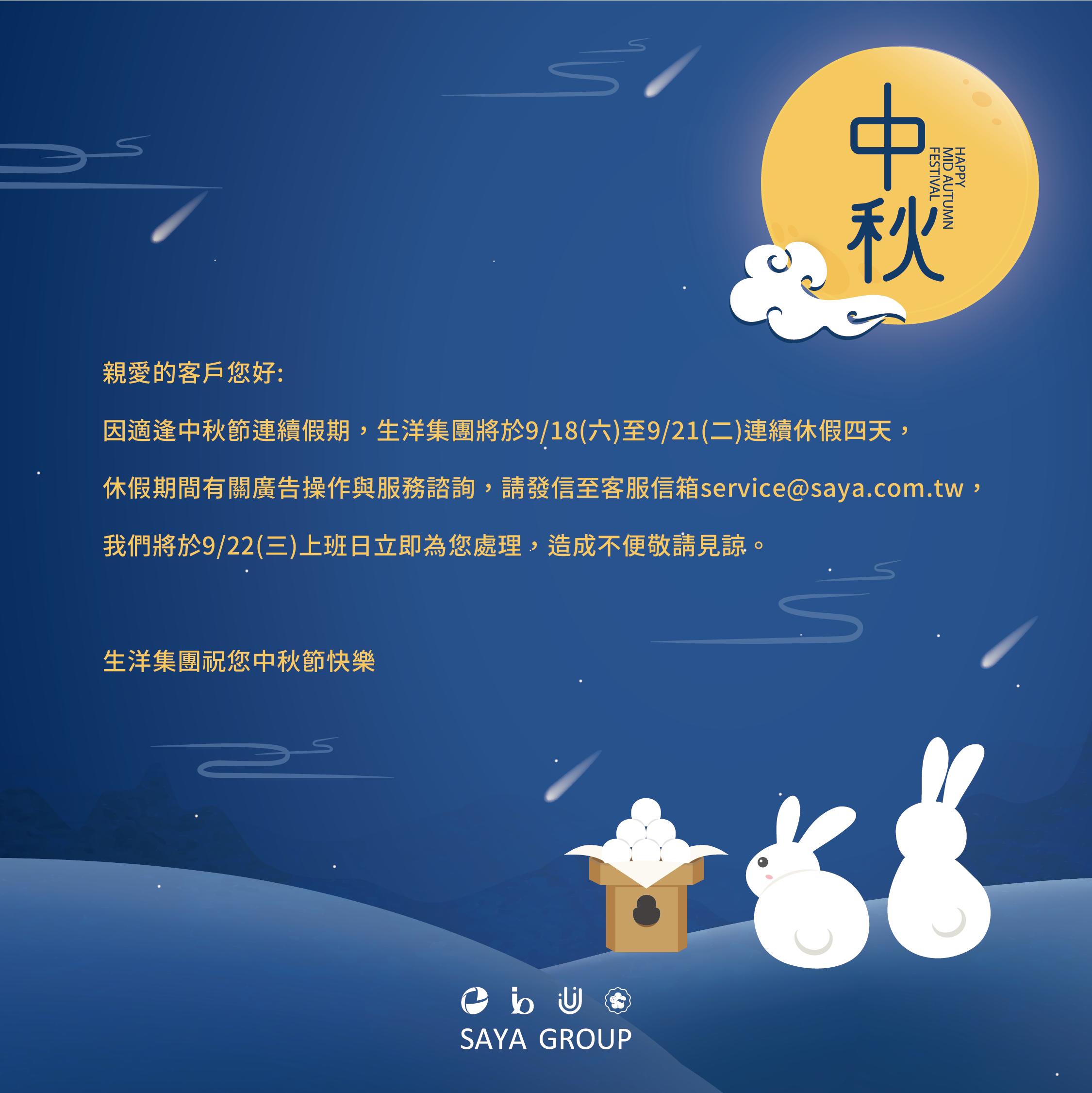 9/18(六)至9/21(二)因適逢中秋節連續假期休假四天