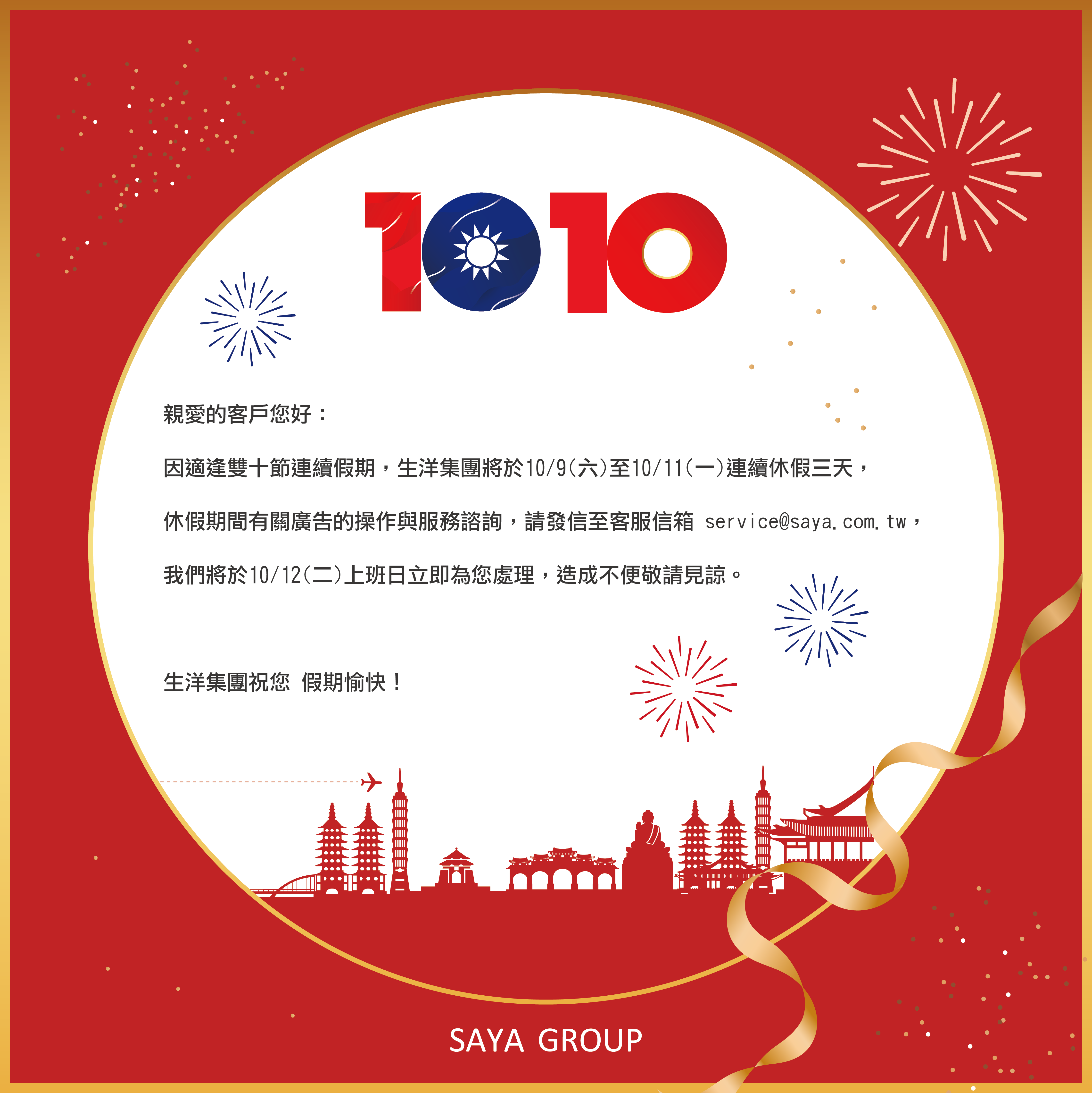 10/9(六)至10/11(一)因適逢雙十節連續假期休假三天