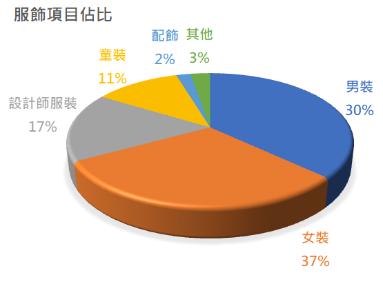 根據國際資料庫Euromonitor International調查顯示,台灣時尚市場以服飾產業為大宗,銷售總金額占比超過50%,而其中又以女裝佔比最大規模,其次為男裝、設計師服裝與童裝。