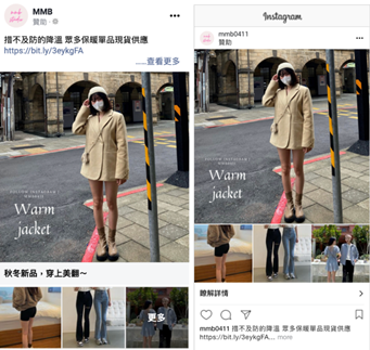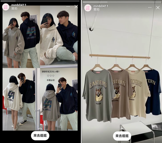 在方才提及的服飾行銷最基礎的元素:呈現商品的視覺或是穿搭特點,可以當作我們廣告的第一步,以下以Instagram限時動態版位為例。