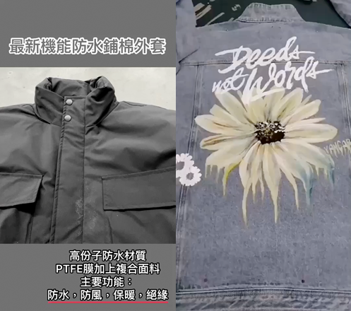 影片案例:左側影片用淋水的方式呈現商品優質防水力;右側影片特寫衣服背後的插畫設計。