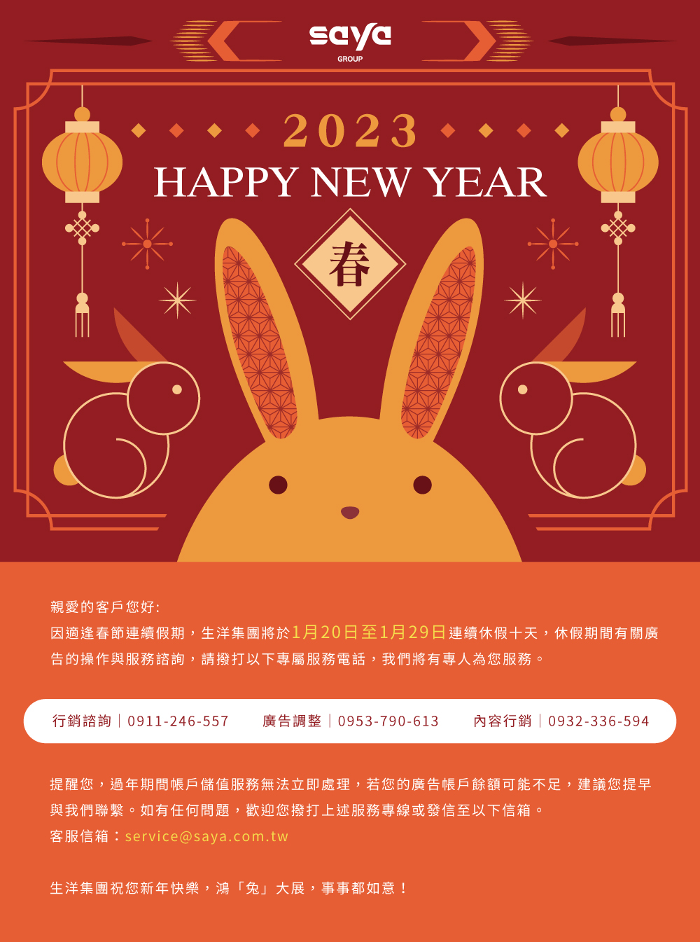 1/20(五)至1/29(日)因適逢春節假期休假十天。