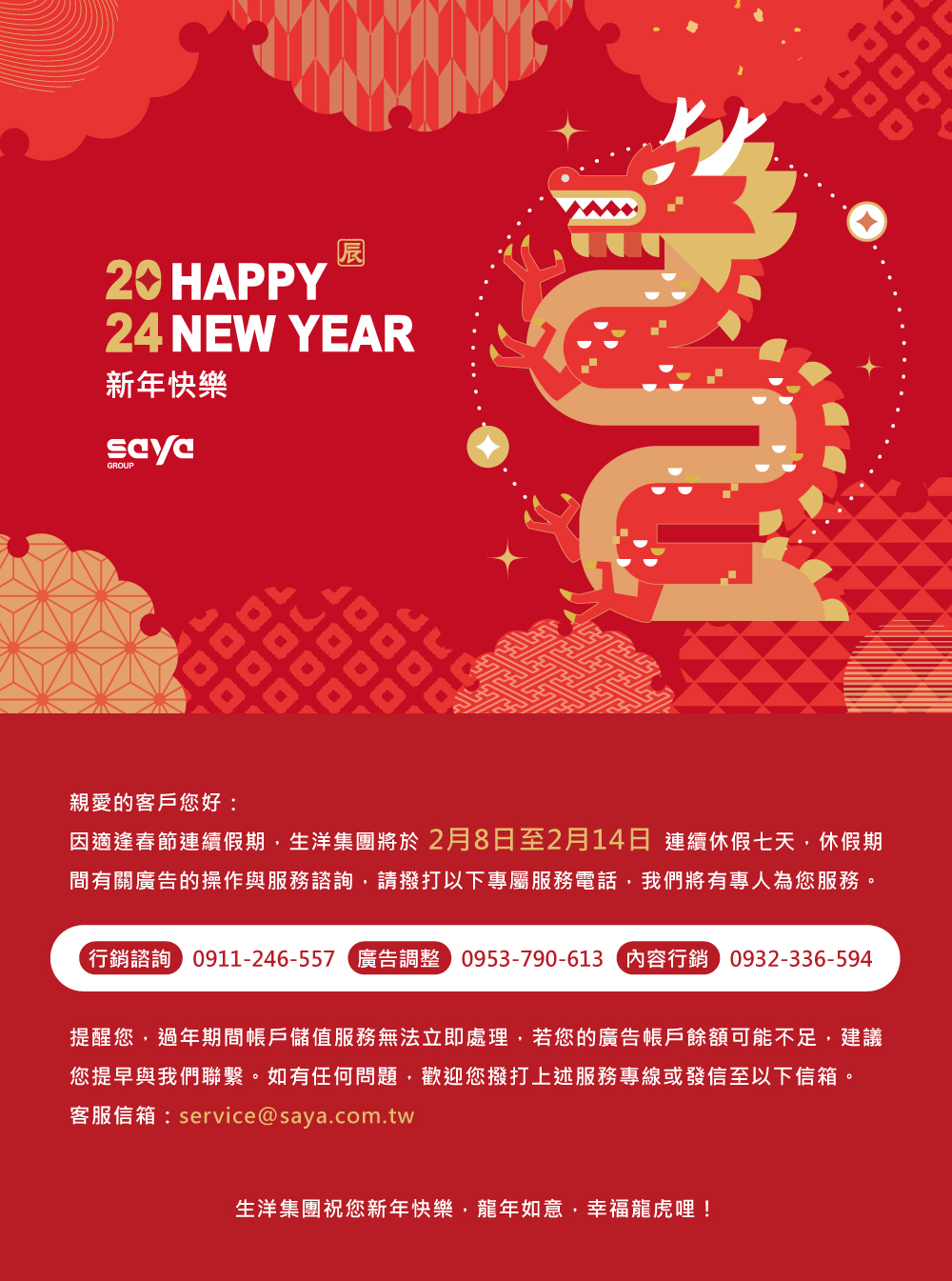 2/8(四)至2/14(三)春節連續休假七天,造成不便敬請見諒。