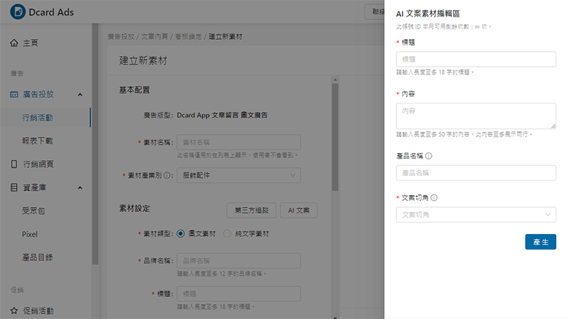 內容行銷已經成為吸引消費者的一大利器,但隨著消費者需求的變化,創造吸引人的內容變得越來越具挑戰性。運用Dcard的AI文案產生器,輸入需求關鍵字或描述,AI能夠快速生成6大切角,無論是幽默風趣的行銷文案,還是深入淺出的產品介紹,AI文案產生器都能幫助品牌輕鬆創作出與Dcard用戶需求高度契合的內容,從而提升互動性和品牌認同感。