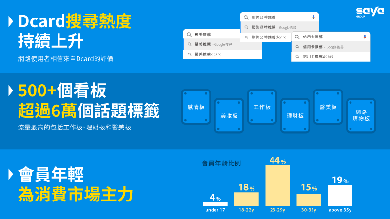 Dcard擁有超過500個看板,其中高流量看板包括工作板、理財板和醫美板,這些看板吸引了對消費和生活品質高度關注的用戶群體,展現出極高的討論熱度和潛在消費力。工作板的討論多涉及公司求職信息和公司口碑,對職場生態產生重要影響;理財板則集結了對金融規劃和投資有深入研究的用戶;醫美板則更專注於那些願意投入高額消費,追求自我提升的消費者。