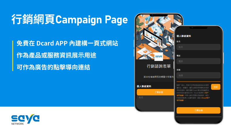 行銷網頁是品牌與消費者之間的重要橋樑。品牌主可以利用 Dcard Ads 行銷網頁功能,創建具有視覺吸引力的頁面來展示產品、服務或活動。這些頁面不僅支援多媒體內容,如圖片、影片和互動元素,還可幫你一頁集結文案、主要賣點,抓住客戶眼光,進而收穫顧客名單!