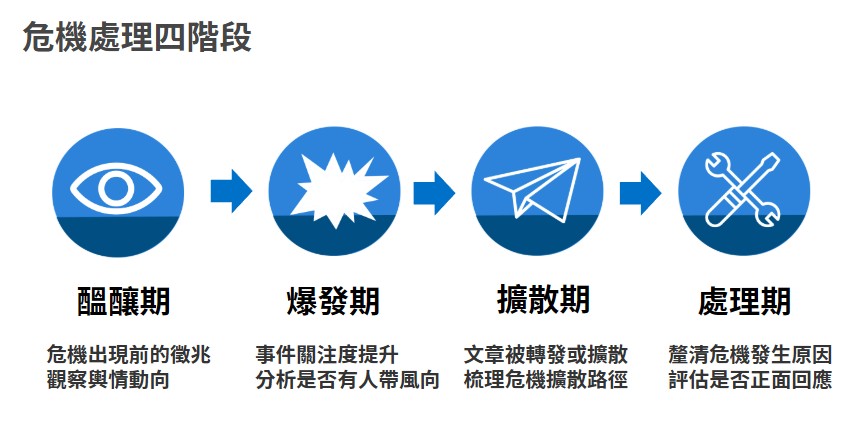 1.醞釀期:在危機發酵的前期,輿論尚未擴散,但已出現端倪,此時應觀察論壇、社群媒體等渠道的輿情動向,適當的採取「冷處理」策略,避免過早介入加劇情況。平日也應積極觀察網路上的相關討論,特別是負面評論,以便能迅速辨別危機的潛在徵兆。