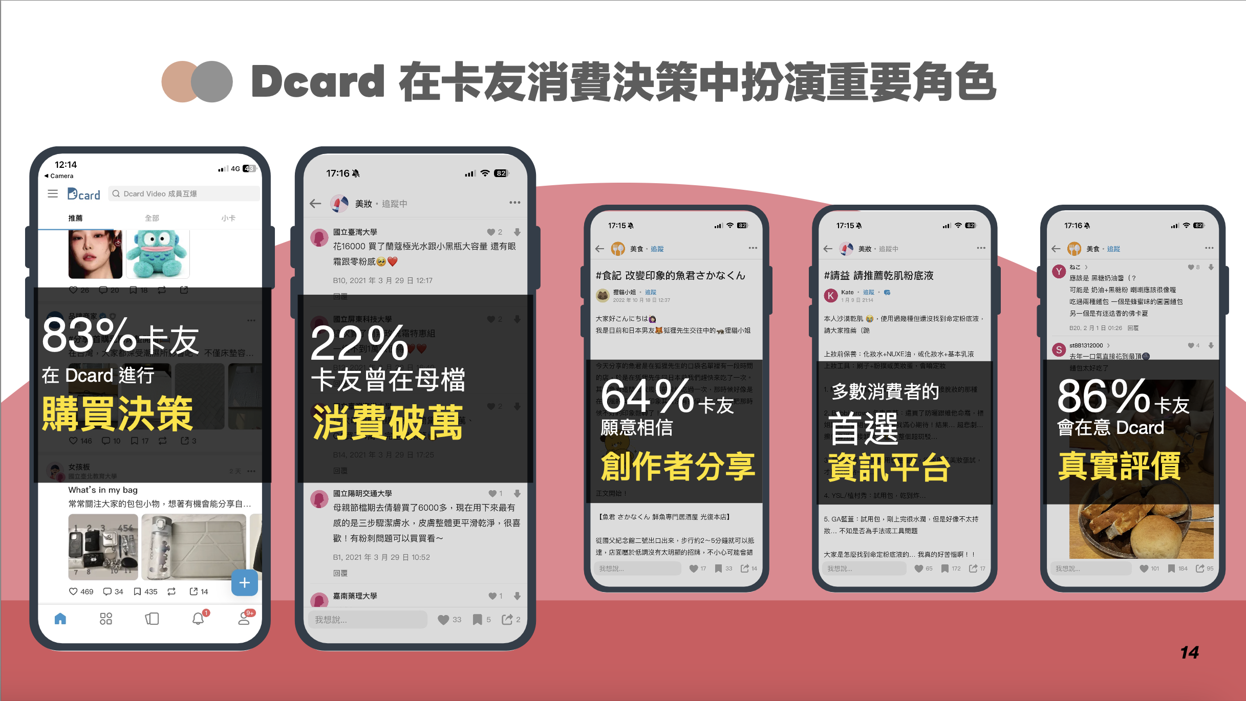 消費者的購物旅程已經變得越來越混沌,他們不再依賴單一平台做決策。現在的消費者會從各大平台接觸品牌資訊,透過Google、Dcard搜尋產品,並主要從Dcard獲取真實評價。調查顯示,高達83%的Dcard用戶會在平台上進行購買決策,86%的用戶特別在意Dcard上的真實評價,更有22%的用戶曾在母親節檔期消費破萬。這些數據清楚展現了Dcard在消費者購物歷程中的關鍵角色。