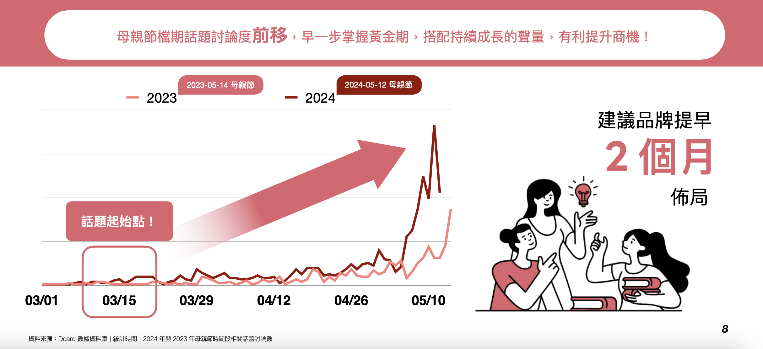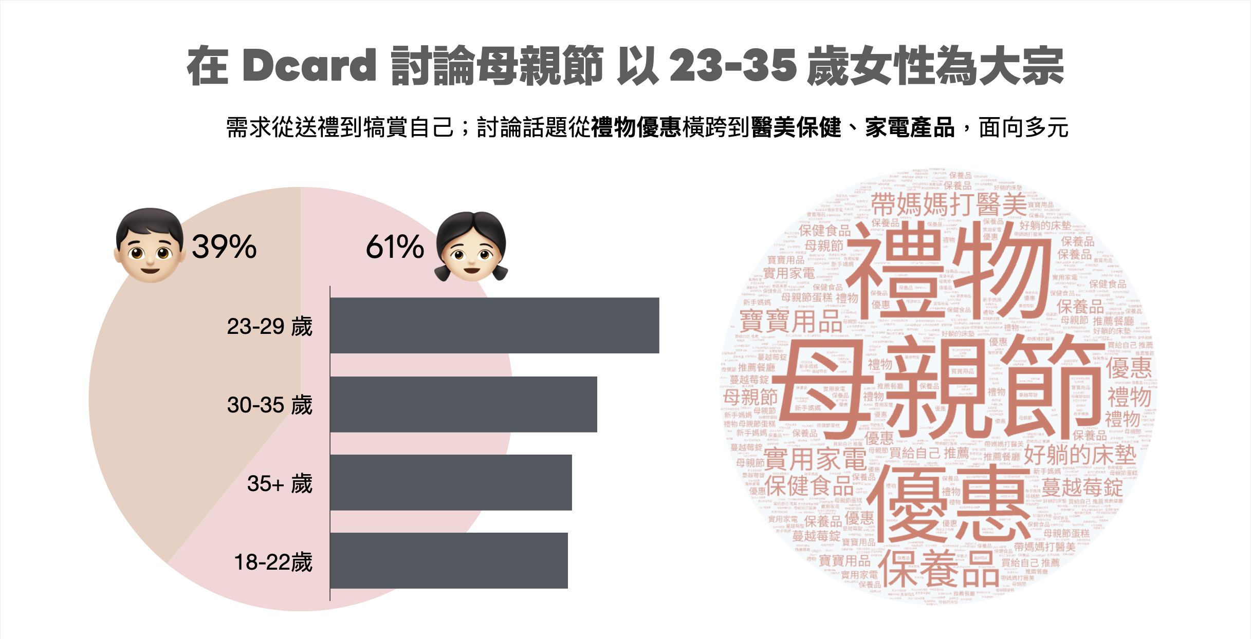 在Dcard平台上討論母親節的用戶以23-35歲女性為大宗,他們的需求從送禮到犒賞自己都有,討論話題也從禮物優惠橫跨到醫美保健、家電產品等多元面向。這些用戶在3月底就開始準備囤貨清單,4月底搜集相關評價,5月初則計算預算。類似地,在送禮需求方面,用戶會在4月初討論餐廳選擇,4月中下旬思考禮物選項,4月底至5月初則考慮預算分配。