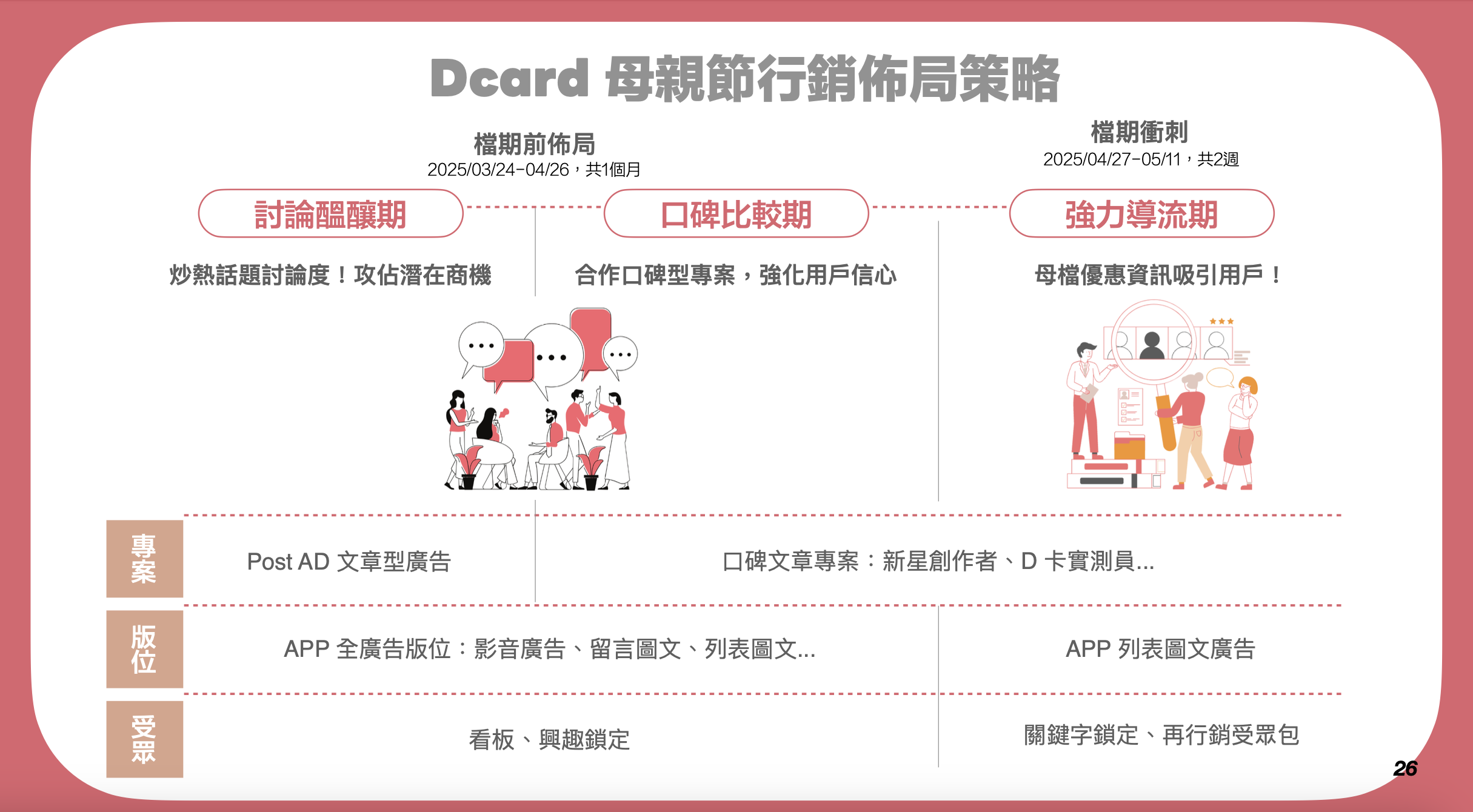 針對2025年母親節,Dcard提供了完整的行銷佈局策略。在檔期前佈局的討論醞釀期(3月24日至4月26日),品牌可透過看板、興趣鎖定和關鍵字鎖定等方式炒熱話題討論度;在口碑比較期和檔期衝刺的強力導流期(4月27日至5月11日),則可採用口碑型專案和列表圖文廣告等方式強化用戶信心並吸引用戶。