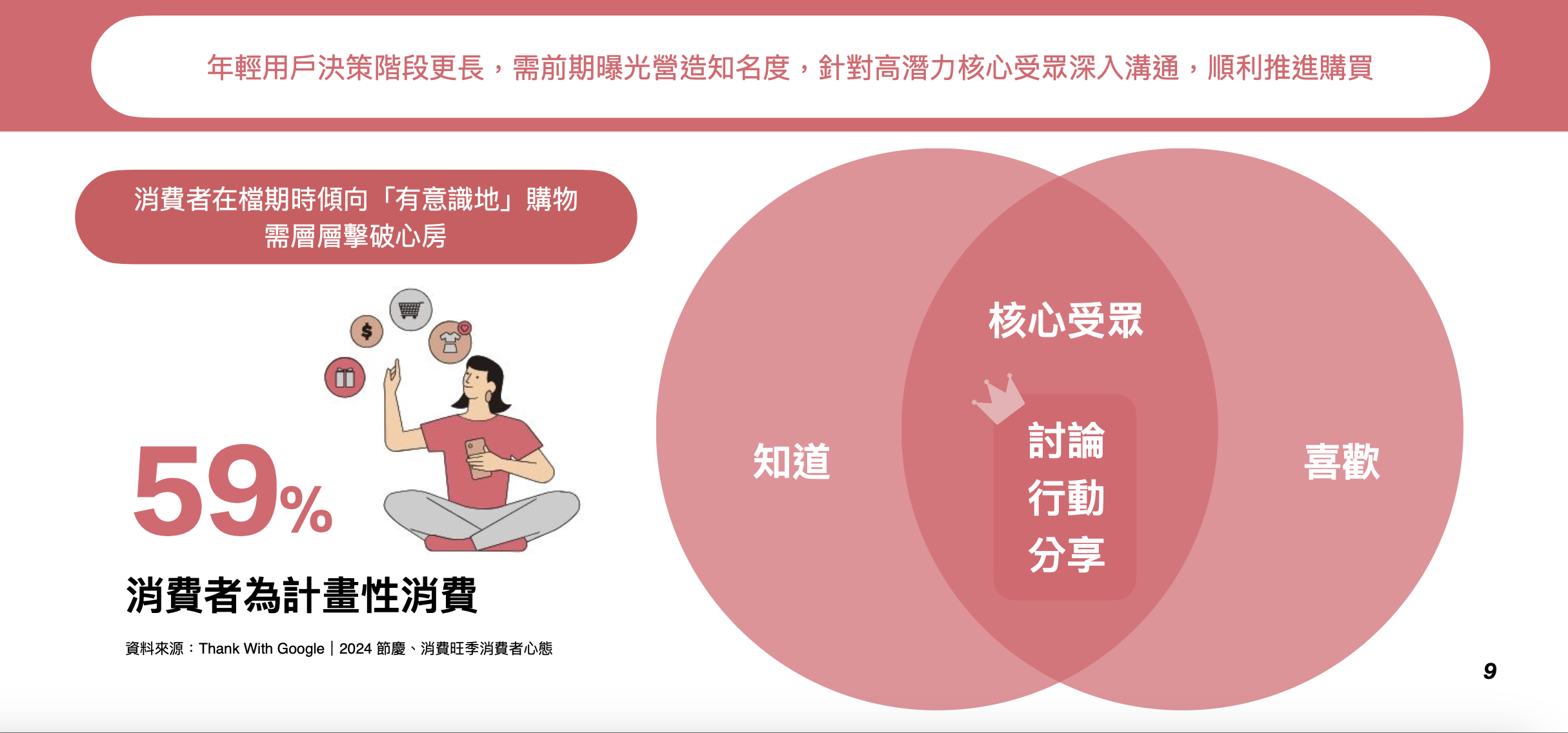值得注意的是,近年母親節檔期話題討論度明顯前移。數據顯示,品牌建議提前至少兩個月開始佈局,搭配持續成長的聲量,才能有效提升商機。尤其年輕消費者的決策階段更長,約有59%的消費者會進行計劃性消費,需要品牌前期曝光營造知名度,再針對高潛力核心受眾深入溝通,才能順利推進購買。