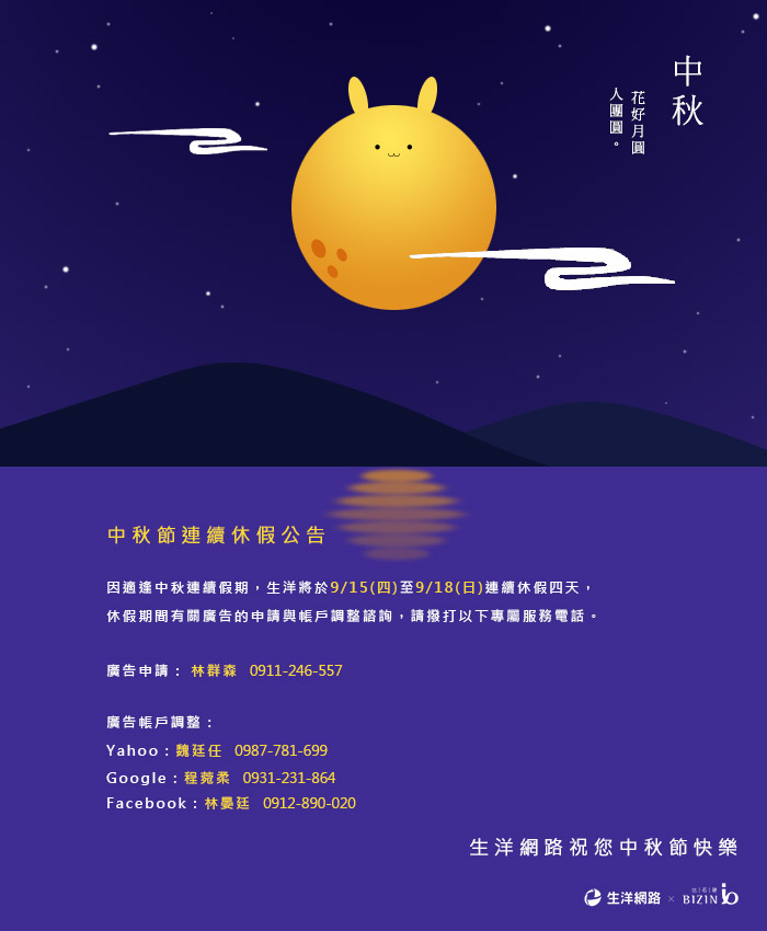 9/15(四)至9/18(日)因適逢中秋節連續假期休假四天。