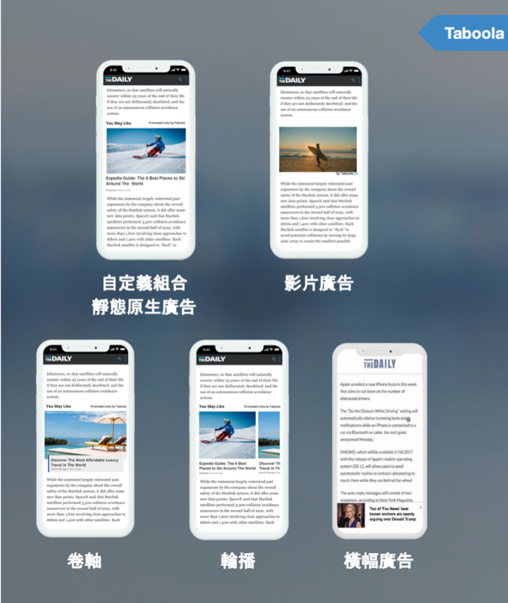 - 將展示廣告素材套用至Taboola內容流量中,以CPC計價,提升素材延用率與廣告效率